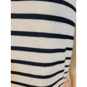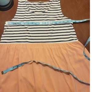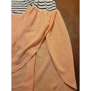 Description -pink white stripe. Pilling. approximately 29.5"; lightweight and flowy; size slits that are layered; Cotton/poly blend;