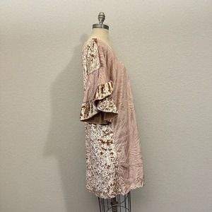 UMGEE USA Leave Print Bell Sleeve Midi Shift Dress Beige Velour Velvet Sz M EUC W7540