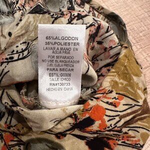 A stylish UMGEE women's blouse in a small size with a tan base and multicolor design. Features 3/4 sleeves, perfect for a casual or dressy look.