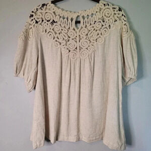 UMGEE linen cotton blend crochet lace puff short sleeves blouse top, size M.