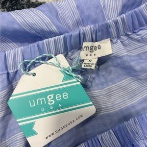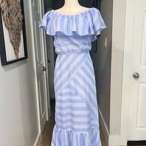 UMGEE white and blue multi directional stripe maxi dress with ruffles