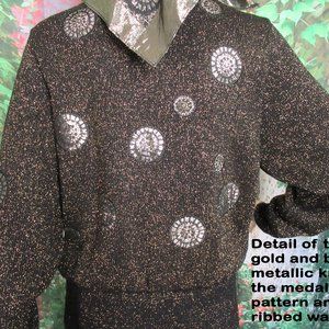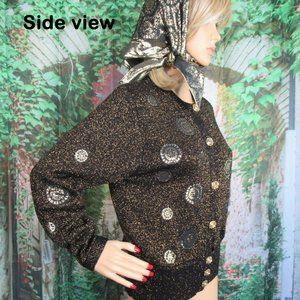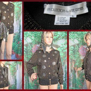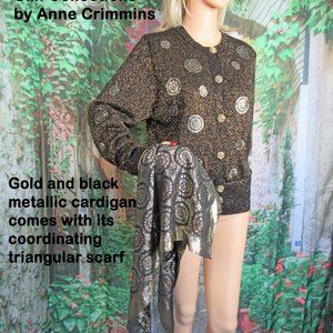 Designed by Anne Crimmins for UMI Collections, this vintage black and gold metallic button front cardigan sweater is a timeless and elegant dressy style. With full length sleeves, a gold medallion pattern on black and gold background, it also has a coordinating scarf. There are 7 round gold tone metal front buttons and ribbed knit at the cuffs and waistband. Made in Hong Kong the fabric is 72% Acrylic, 18% Nylon and 10% Polyester Metallic.