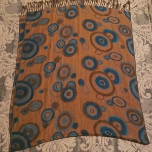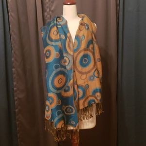 VERY few teeny tiny flaws, that would pass on a new on the rack piece! Beautiful teals and tans with fringes. Both sides are lovely and will add a touch of style to your ensembles. Wonderful for Summer nights and Autumn days. It was close to $100 new! This is SURE to become your favorite!