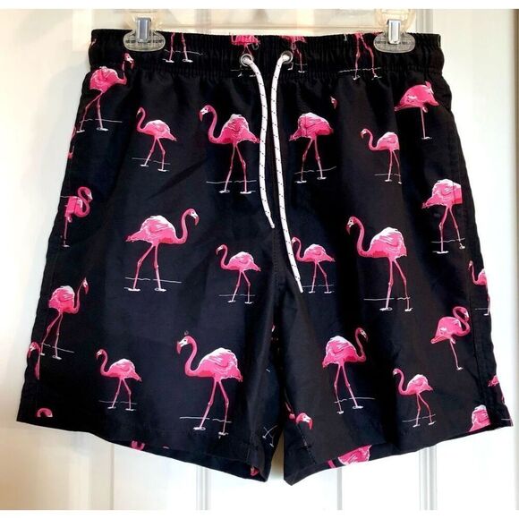 Unbranded black board shorts/swim trunks in men’s size medium with pink flamingos. These have a mesh liner and three pockets – two hand pockets in front and a back pocket with Velcro closing. Elastic waist and drawstring. These are 100% polyester, so machine wash in cold and hang to dry. The waist measurement is 30” in circumference (without stretching the elastic at all), the inseam is 6” and the rise is 12”. Stylish, functional, and NWOT! 🦩