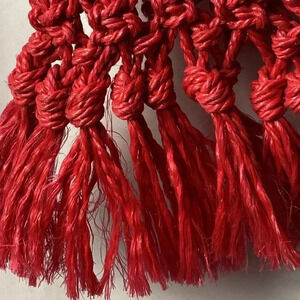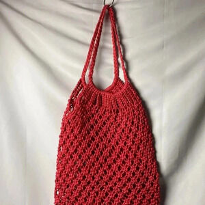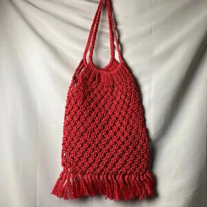 UNBRANDED MACRAME WITH FRINGE SHOULDER PIRSE SHOPPING BAG BOHO LOOK CORAL RED OPEN WEAVE UNLINED BRAIDED HANDLE LENGTH MEASURES APPROX 37” FROM TOP OF STRAP TO FRINGE PURSE BODY MEASURES APPROX 22” PURSE WIDTH MEASURES APPROX 12” FROM SIDE TO SIDE. FUN CHIC BOHO LOOK