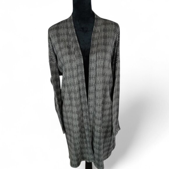 Women's Plaid Full Length, Open Front Cardigan in the colors of Gray, Black, and Cream is a nice medium weight with a relaxed fit.