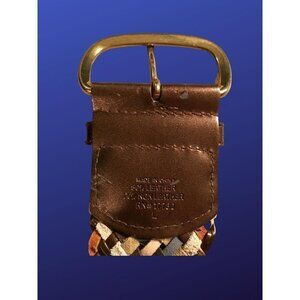 80% leather, 20% non-leather;Copper/Blue/Brown/Beige leather strips woven into a multi-color “basket weave“ pattern; metallic copper-colored leather accents; gold tone buckle; 2.5” wide, 41” long.