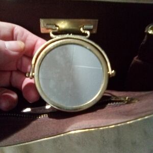 Cute unbranded gold clutch handbag. has a zippered pocket and attached mirror. Extra front pocket. Snap closure.