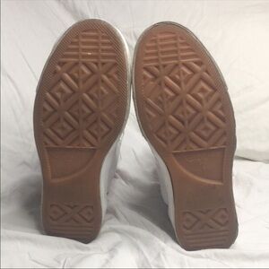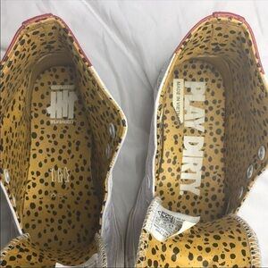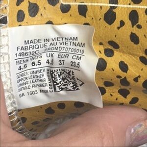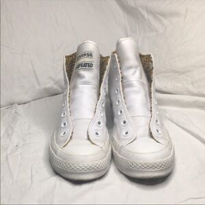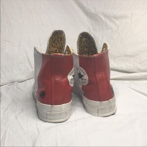 Los Angeles’ Undefeated celebrated the 13th anniversary of their La Brea retail location with this exclusive Converse Chuck Taylor All-Star '70s High Top,which dropped in September 2015 alongside a black colorway.This model features a white leather upper with a block of red at the heel, accented with an animal print lining.Co-branding emerges on the tongue and heel, while the shoe sports a thicker insole and a higher toe cap.Like New I removed laces for storage, laces will come in package no box