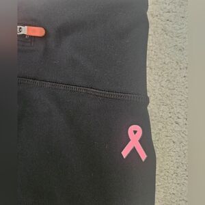 UNDER ARMOR Breast Cancer Awareness Pink Ribbon Leggings | SZ Small - "She's A Fighter" printed on inside back waist with pink ribbon throughout waistband; breast cancer awareness pink ribbon printed on pants back; bright pink accents Very good condition - light overall wear but no damage
