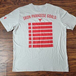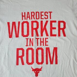 For sale is a t-shirt from Under Armour in collaboration with Dwayne "The Rock" Johnson's Project Rock. It is in excellent used condition with no major signs of wear. This light tan or beige shirt is from Under Armour's Heatgear line, and reads "Hardest Worker in the Room" in red lettering with a bullhead underneath. The back reads "Iron Paradise Goals:" with a stack of weights. Great for working out and going to the gym or other exercise. Size x-large, approximate measurements: chest- 48", waist- 48", length from armpit to bottom- 20".