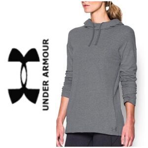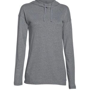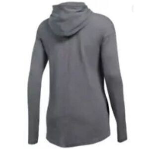 Under Armour makes this Heat Gear Women's Stadium Hoodie lightweight pull-over in Graphite. This one is in ladies size SMALL. It's 55% cotton, 34% polyester and 11% rayon, so machine wash and tumble dry. WIcks away sweat to keep you cool, dry and light. It dries fast and has a natural Heather look. It has a hooded neck, long sleeves and a hidden kangaroo pocket. It's designed to fit tight to your skin under your outerwear. The pit-to-pit measurement is 19.5" (without stretching), the length is 27.5" and the sleeves are 22". This is a great layering piece and it's NWT!