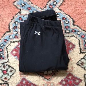 Well worn but still super comfy. Solid black leggings with small hole in right upper-thigh. High waisted. Ankle grazers. (Spots on photos are not stains, just fuzz from the rug)