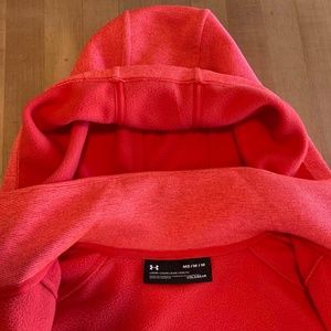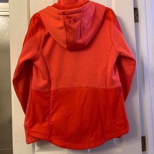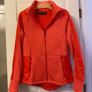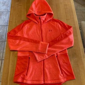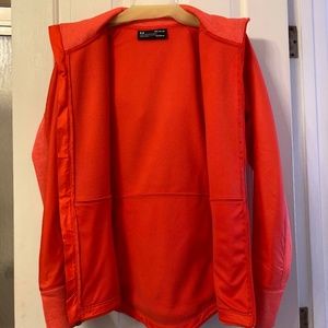UNDER ARMOUR Orange fleece-lined, hooded jacket, Size M. Active wear with extra weather protection. Perfect for hiking, running or any outdoor activity in less than perfect weather. The darker orange fabric is nylon and provides wind/rain resistance. The body and hood are double layered with a fleece lining. Lightweight and stretchy, yet warm! Worn only once. EUC. From a smoke-free home.