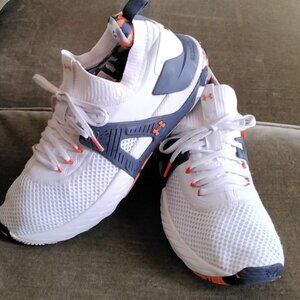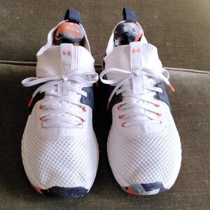 Used Under Armour Project Rock 4 Marble "STONE JET GRAY" photos appear white, however these shoes are more of a creamy stone color. No stains, only sign of wear on inside heal tab, see photo please. Very good condition.