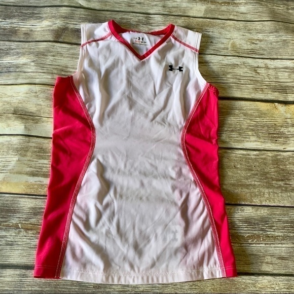 Under Armour. Large. Excellent condition. Pink and white sleeveless tank. Black under Armour logo. Heat gear. Smoke-pet free home. 2+ items discounted.