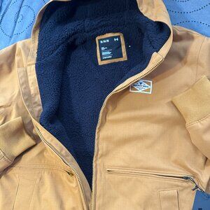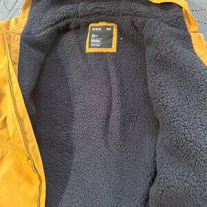 for sale is a UNDER ARMOUR THE ROCK " WORK JACKET HOODIE, FULL ZIPPER, is GOOD TO WEAR ON THE WORK, HIKING, HUNT, size MEDIUM men NWT $160.00 the color is #707 = YELLOW OCHRE and WHITE/BEIGE LETTERING and THE ROCK LOGOS and UNDER ARMOUR LOGO, HAS SIDE POCKETS AND ZIP. POCKETS, MATERIAL= POLYESTER, with SHERPA INSIDE, PLEASE CHECK=MEASUREMENTS ARE: M=chest: 23"=46" around L: 27" MORE OR LESS **