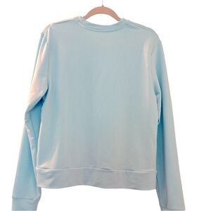 Very soft sweatshirt, lightweight knit, pretty baby blue or light blue color or aqua. The tag says this is the Loose fit. Two side pockets.