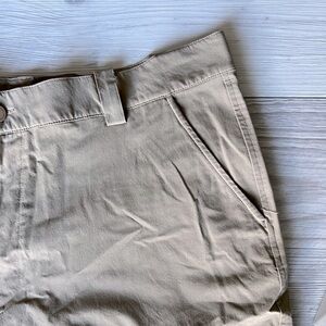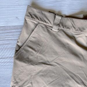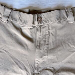 Under Armour Performance shorts. Tan color. Zipper with top button closure. Belt loops. Stitched Under Armour logo on middle, back belt loop. Four pockets. Mens size 38R.