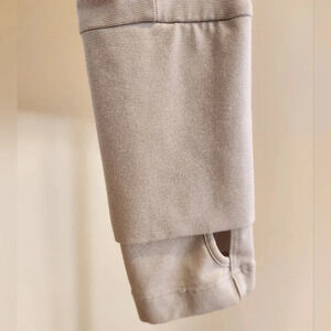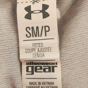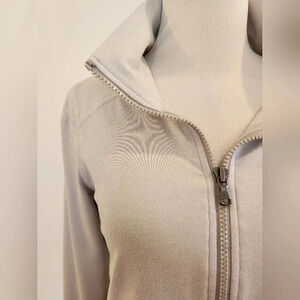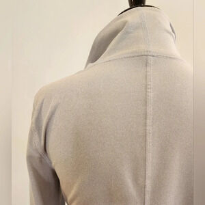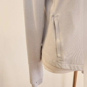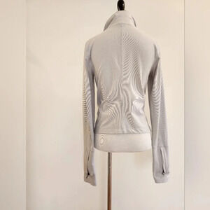 Under Armour zip up jacket in a size small. Zipper goes up to the mockneck. It has long sleeves with zippers and thumbholes. The seams are all topstitched for extra strength. At the waist there are slit style pockets with zippers. Fabric is silver/white fine stripes.
