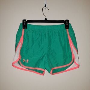 UNDER ARMOUR GREEN AND NEON CORAL WHITE LOOSE RUNNING SHORTS SIZE YOUTH LARGE