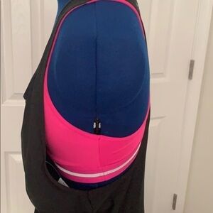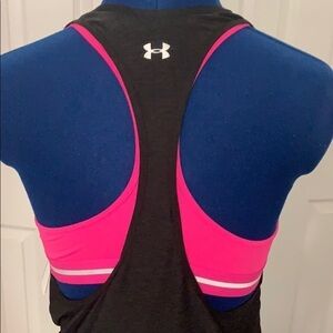 Perfect condition this two in one top from Under Armour is made to perform. AllSeasoned gear line, great color combo of pink with slate gray. Lots of support and thicker quality fabric. No pads in bra. XS