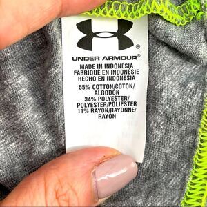 Soft, breathable, lightweight fabric. Light heather gray base with fluorescent green letters/branding. Discontinued style. Smoke-free and pet-free home.
