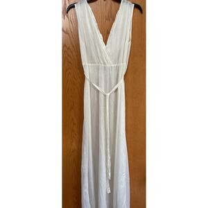 Vintage long nightgown by Undercover Wear, Inc., in size medium. Deep V neckline in front and back. 100% nylon. Embroidered/lace inset under bustline. Ties on either side to tie in the back. Beautiful pleating in the front along the V neckline.
