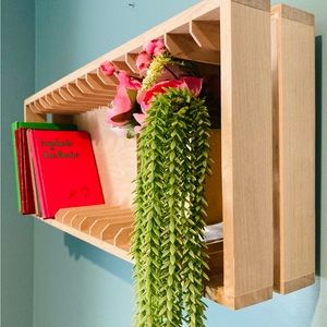 Cute solid pine wall hanging rack. Measures 23” wide x 4” deep and 9” tall.