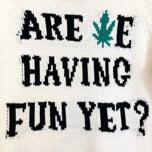 UNIF Are We? This super comfy knit sweater features a bold, eye-catching "Are We Having Fun Yet?" graphic that's perfect for making a statement. Perfect for 4/20. Made from a soft, cozy fabric, it's an oversized fit that's ideal for laid-back style and effortless cool. Whether you're heading to a casual get-together or just lounging at home, this UNIF sweater is a must-have for anyone who loves unique graphic apparel and a touch of rebellious spirit.