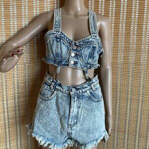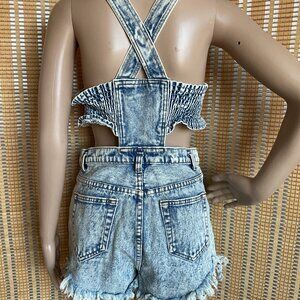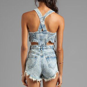The UNIF BUNDY JUMPER in size M is a stylish and trendy piece perfect for women looking for a unique addition to their wardrobe. This blue denim jumper features a high rise and a cut-off style, giving it a distressed and edgy look.