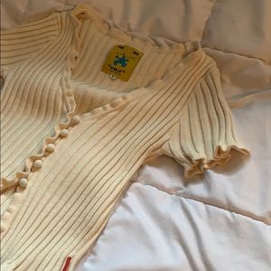 Stylish UNIF top in cream. Features ribbed texture and button-up design. Short sleeves with ruffle edges.