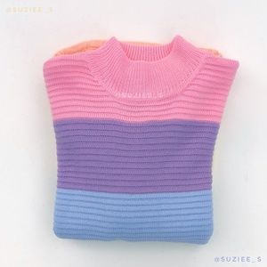 - Oversized slouchy ribbed knit sweater with mock neck, pink, purple, blue, green, yellow & orange striped, long sleeves and curved hem