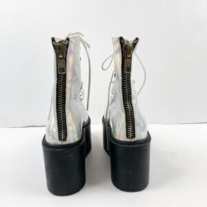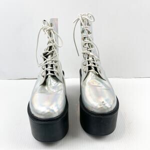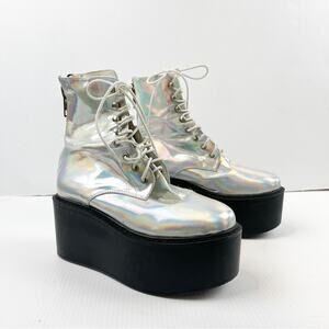 Space age platform boot in holographic vegan leather, from UNIF. Exposed zip closure down the back for easy on/off + a textured sole for optimal traction. Topped with tonal laces in corded cotton and polished metal eyelets.