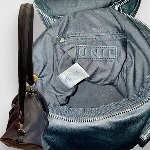 Gothy & chic black leather bag by UNIF. Features silver zipper and hardware. Stylish and versatile.