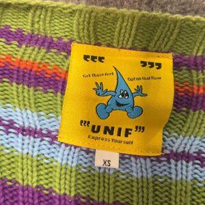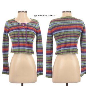 Out of production and not easy to find! Y2K grunge 90's inspired crop sweater in multicolor stripes. Overall great condition, there is some wear/fraying at the neck as shown and the care tag is partially faded. Measures approximately 15" pit to pit, 23" sleeves, and 17" shoulder to hem. 100% cotton, recommend hand wash and dry flat. Smoke free home but we do have pets. BIN13