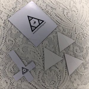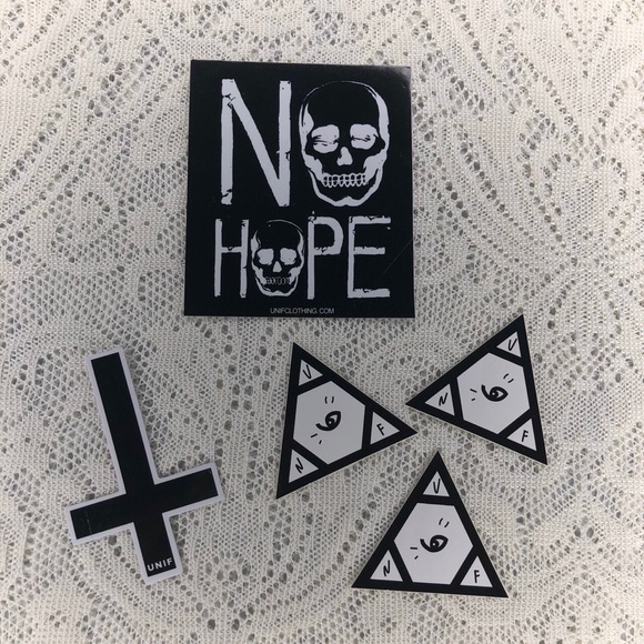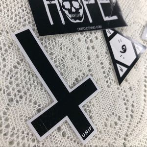 discontinued unif stickers! Includes: 3 retired unif logo mini triangles, the no hope skull sticker, and upside down cross sticker. Perfect decoration for your stash box, mirror, record player, agenda, a console, etc. etc. make your goodies even cuter!