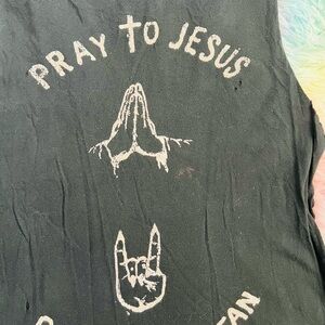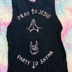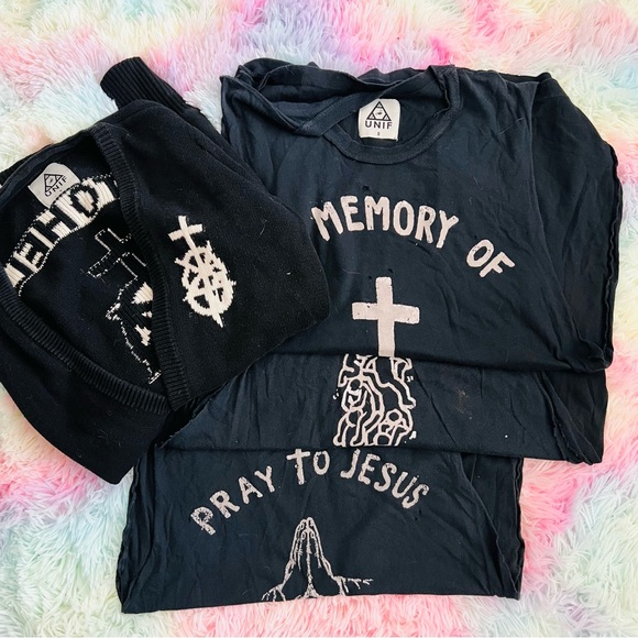 Unit graphic tees. Features bold text and cross design. Perfect for casual wear.