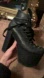 UNIF hellbound black leather stacked platform ankle booties with silver eyelets, size 9. Interior zipper. Obvious signs of use, 2 hooks are missing. 7” heel. Incredible boots