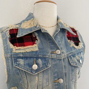 Super Edgy Distressed Sleeveless Denim Plaid Vest