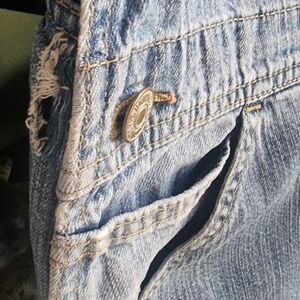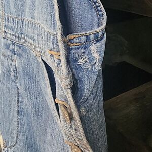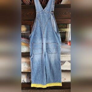 Classic blue denim capri overalls with a distinctive patch. Features bold stitching. One of the buttons missing but can be easily fixed.
