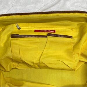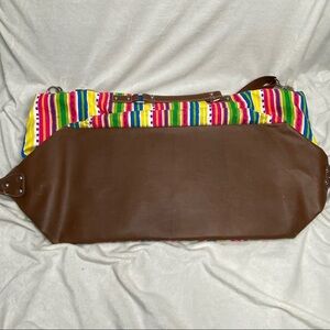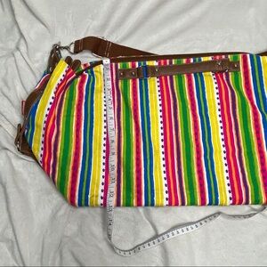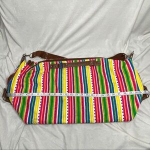 UNIONBAY multi color striped weekender duffel bag with 2" drop carry handles, removable adujstable shoulder strap. Yellow lined interior, brown semi-hard bottom, inside zipper pocket, two open pockets.