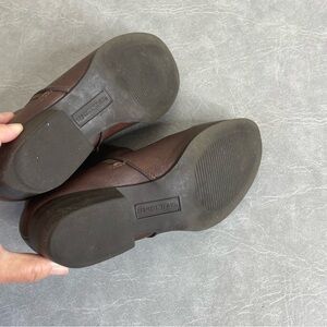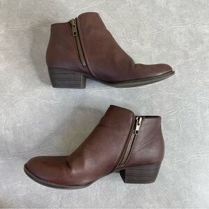 Elegant chestnut faux leather boots with a classic design. Ideal for versatile wear. Zippers on both sides of ankle. Only one zipper is actually functional.