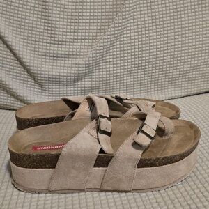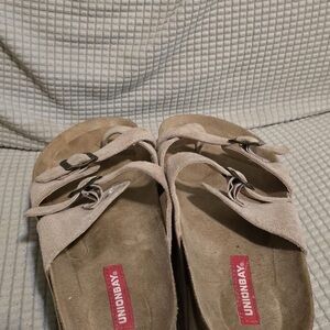 Experience the perfect blend of style and comfort with UNIONBAY's tan sandals, featuring a versatile open heel design and multiple strap details. These sandals are crafted with a natural-colored footbed and a suede-like upper, making them an ideal choice for casual outings.