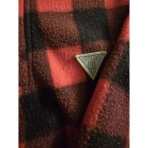 The product is a vintage UNIONBAY Buffalo plaid fleece pullover jacket in size Large. It features a red and black plaid pattern with a 1/4 zip design, making it a stylish and comfortable choice for women. The boxy style and basic jacket design add to its versatility, while the fleece fabric provides warmth and texture. Perfect for adding a pop of color to any outfit, this jacket is a fashionable and functional addition to any wardrobe.