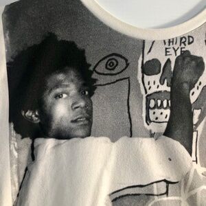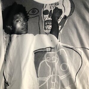 UNI-QLO Basquiat - Warhol Collab T-Shirt SPRZNY. Black & White graphic photo T depicting Basquiat painting "Third Eye" painting on white ground/T