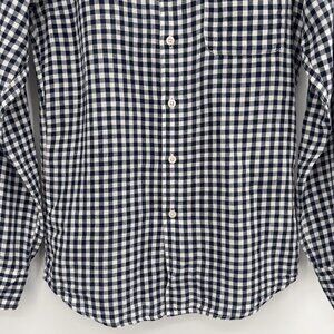 Classic and versatile UNIQLO navy and white gingham button-down shirt made from lightweight, breathable 100% linen — perfect for spring and summer wear. Features a chest pocket, button cuffs, and curved hem. Crisp yet casual, it’s easy to style with jeans, chinos, or shorts. Size XS