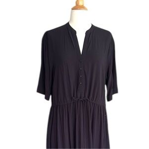 This is a versatile black dress with a relaxed fit. It has a split v-neck, half length short sleeves, a waist drawstring, gathered long skirt and side seam hand pockets. Constructed in 100% rayon.