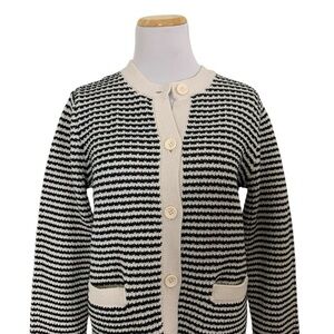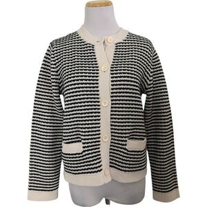 Uniqlo Knitted Short Jacket Women’s size large. Black and cream. Heavyweight knit cardigan type sweater/jacket. Acrylic/polyester/cotton blend. Pockets. Button closure. Good preowned condition. Free of rips, holes or stains.