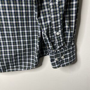 Green, navy blue and white tartan plaid button-down long sleeve shirt